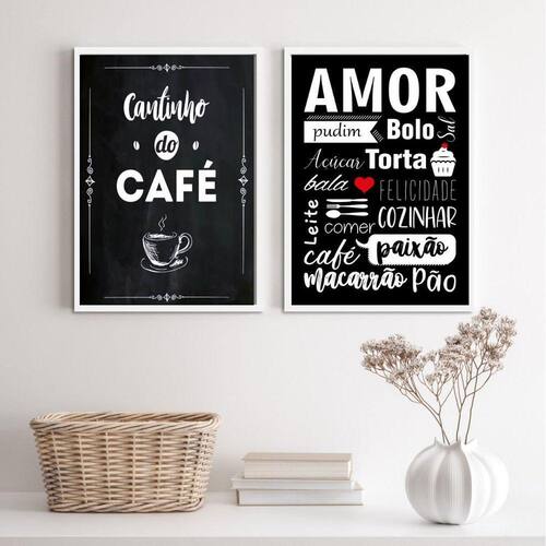 O Kit 2 Quadros Cantinho do Café Amor Cozinha 24x18cm - Vidro é perfeito para decorar diversos ambientes, como quarto, sala, cozinha, escritório, área gourmet e muito mais. Com medidas de 24x18cm A5 , cada peça possui uma linda moldura de madeira preta que traz elegância e sofisticação para qualquer espaço.