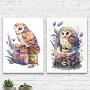 Kit 2 Quadros Coruja Mágica Aquarela 45X34Cm