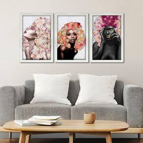 Kit 3 Quadros Decorativos 20x30 Mulheres Rosto Flores Rosas