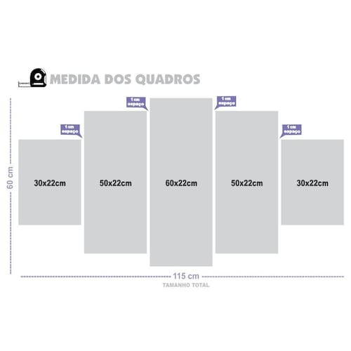 - dimensões: Tamanho total do quadro montado na parede: 115cm x 60cm