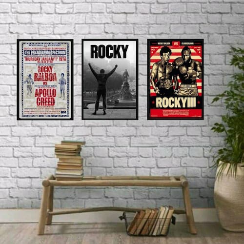 O Kit 3 Quadros Decorativos Rocky Balboa Posters 24X18Cm é perfeito para quem busca dar um toque especial à decoração de diversos ambientes, como quarto, sala, cozinha, escritório e área gourmet. Com medidas de 24x18cm A5 , cada peça possui moldura de madeira preta, que confere um acabamento elegante e sofisticado.