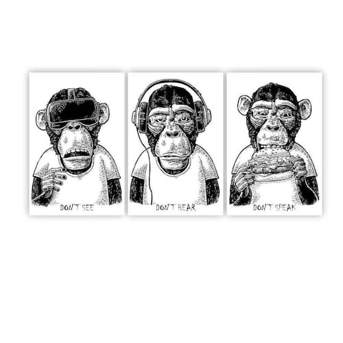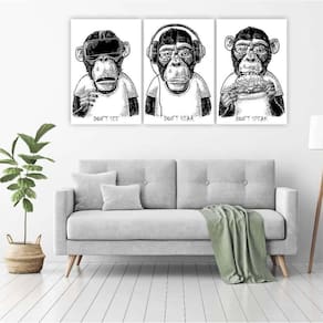 Quadros Decorativos Três Macacos Sábios Dont See Hear Speak 80X60 Kit 3 quadros decorativos mosaicosMaterial:Quadros decorativos produzido em mdf- medidas por peça:1 peça de 80x60cm1 peça de 80x60cm1 peça de 80x60cm Medida total do quadro instalado 180x80cm - informações técnicas: O quadro não precisa de moldura, estão pronto para pendurar na parede. São feitos em adesivos fosco e impressos em alta qualidade. Aplicado em mdf com espessura de 3mm. Não é necessário furar a parede para instalação, pois, enviamos fitas 3m com grande poder adesivo para facilitar a instalação. É necessário na hora da instalação posicionar o quadro em 1cm de largura entre eles para melhor qualidade de visualização.- instalação:Limpe o local que vai ser instalado o quadro com um pano úmido, após secar o local, visualize comoVai ser o alinhamento, e retire a proteção da fita dupla face parte verde da fita e pressioneNo lugar desejado para a fixação.- limpeza após fixação:A limpeza pode ser realizada apenas com um pano seco macio, se desejar pode ser úmidoPorém sem conter álcool ou produtos químicos.