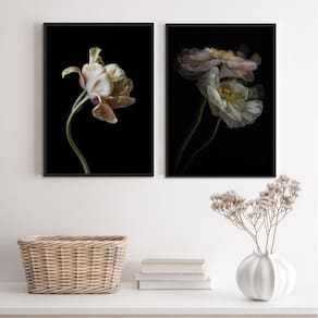 Kit 2 Quadros Flores Tons Bege Fundo Preto 45x34cm