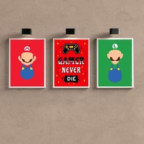 O Kit 3 Quadros Para Quarto Gamer Game Never Die 33X24Cm é perfeito para decorar o ambiente dos amantes de jogos. Com moldura de madeira preta, esses quadros trazem um toque especial para o quarto, sala, cozinha, escritório, área gourmet e muito mais.