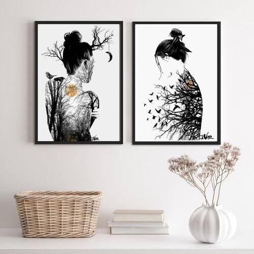 O Kit 2 Quadros Mulheres Árvores Pássaros Lua é perfeito para decorar diversos ambientes da sua casa. Com medidas de 33x24cm A4 , cada peça possui um lindo design que combina mulheres, árvores, pássaros e a lua, trazendo uma atmosfera encantadora para o seu espaço.