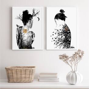 Garanta agora mesmo o Kit 2 Quadros Mulheres Árvores Pássaros Lua e transforme a decoração da sua casa com muito charme e estilo.