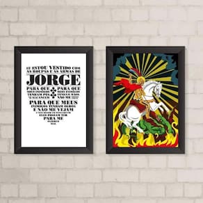 Especificações técnicas: - Título: Kit 2 Quadros São Jorge Guerreiro Oração 24x18cm - Com Vidro - Material da moldura: Madeira preta - Material do papel: Papel fotográfico brilhante de altíssima resolução - Medidas de cada peça: 24x18cm A5 - Acompanha vidro para proteção da imagem - Moldura em madeira maciça na cor preta - Acompanha pendurador - Embalagem segura com plástico bolha de camada dupla - Garantia de 3 meses