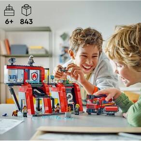 Quartel com Caminhão de Bombeiros - Lego 60414 Conjunto de brinquedo LEGO City Corpo de Bombeiros com Caminhão de Bombeiros para maiores de 6 anos O corpo de bombeiros de brinquedo vem com 5 minifiguras de bombeiro e uma figura de cão bombeiro Inclui um caminhão de bombeiros de brinquedo com uma mangueira, escada modular e acessórios de extintor Salve o progresso, amplie e gire o modelo em 3D com o aplicativo LEGO Builder Dê este conjunto como presente de feriado ou aniversário para maiores de 6 anos As crianças expandam a brincadeira com outros conjuntos vendidos separadamente da linha LEGO City LEGO City é um lugar onde as crianças podem dar liberdade à sua imaginação ilimitada O quartel dos bombeiros neste conjunto de construção de 843 peças tem mais de 32 cm de largura Homologação Inmetro: 00829/2021-BRINQ-1 Ean: 673419388894