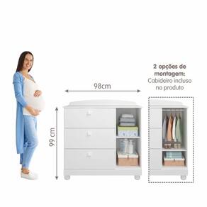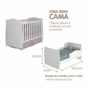Esse modelo de berço foi desenvolvido pensando na fase bebê e na fase onde seu pequeno ou pequena já não quer mais ficar no berço. Para isso desenvolvemos um produto que pode se transformar em MINICAMA . Assim quando eles já forem maiores terão uma caminha linda e aconchegante para as noites de sono e você não precisará trocar seu móvel por um bom tempo. Nosso berço Conforto é fabricado com matéria-prima 100% MDF, um material ecologicamente correto e de ótima durabilidade e resistência. É um produto sinônimo de SEGURANÇA, pois é fabricado conforme as normas exigidas pela ABNT e certificado pelo INMETRO (Certificaçao Compulsória de segurança INMETRO).Possui 2 regulagens de altura para o estrado (uma mais alta para quando o bebê ainda é bem novinho e ainda não consegue sentar e outra mais baixa para quando o bebê já se movimenta e consegue ficar sentado). Atenção para a altura do colchão que não pode passar de 12cm. Suas 2 grades laterais são fixas para maior segurança e a régua superior e inferior são fabricadas com MDF de 2,5cm o que proporciona ainda mais segurança. Possui também 4 rodízios giratórios, sendo 2 com trava e 2 sem trava. As bordas são todas arredondadas e recebem pintura em lacca com tinta atóxica e as peças retas recebem pintura UV também com tinta e verniz atóxicos. Enviamos junto com o berço uma peça de ferro pintado (varão mosquiteiro) que encaixa nas cabeceiras e serve para colocação do cortinado, evitando assim que os pequenos sejam picados pelos mosquitos.Berço desenvolvido para uso de colchão padrão americano de 0,70x1,30m ; Acompanha o colchãoRegistro inmetro 00421-2018  Medidas do móvel montado ALT 103cm X COMP 133cm X PROF 81cm;  01 Cômoda Fofura Suas formas curvas conferem ao móvel um toque decorativo no quarto dos pequenos. Possui 3 gavetas grandes com corrediças metálicas e fundo encaixado que proporciona maior resistência. Possui também 1 porta de abrir com prateleira interna e 1 cabideiro para você montar de acordo com sua necessidade. Seu tampo possui bordas arredondadas que recebem pintura em lacca com tinta atóxica e as peças retas recebem pintura UV também com tinta e verniz atóxicos.   Fabricada com matéria-prima 100% MDF, um material ecologicamente correto e de ótima durabilidade e resistência.A porta possui detalhe vazado que recebe um material transparente que é PETG cristal, um termoplástico resistente a impactos e de excelente acabamento. Os puxadores são de plástico ABS com ótimo acabamento e resistência. Os pés, também em ABS, já estão inclusos no produto. Medidas do móvel montado ALT 99cm X LARG 98cm X PROF 43cm;