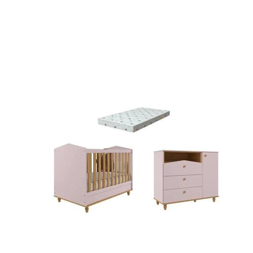 Quarto Bebe Berço e Cômoda MDF Dorabelly Sinha + Colchão - Rosa Claro