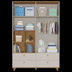 Seguindo o estilo lúdico, esse roupeiro é perfeito para quem deseja um móvel para organizar e, também, decorar. O detalhe fica por conta dos nichos laterais e as portas em formato casinha. Os puxadores e pés são torneados em madeira maciça e conferem um charme especial ao produto. Possui 4 gavetas grandes com corrediças telescópicas que proporcionam deslizamento suave, maior abertura e melhor acesso às roupas. Os nichos laterais podem ser utilizados para objetos decorativos, cestos para organização de brinquedos, livros e etc. Os espaços internos de prateleiras e maleiros são ideais para guardar desde objetos menores até objetos maiores como malas, pacotes de fraldas e caixas ou cestos de organização. Fabricado com matéria-prima 100% MDF, um material ecologicamente correto e de ótima durabilidade e resistência, esse roupeiro é excelente para quem precisa de bastante espaço para organizar tudo com muito carinho. O acabamento de pintura é feito com tinta e verniz UV atóxicos.
