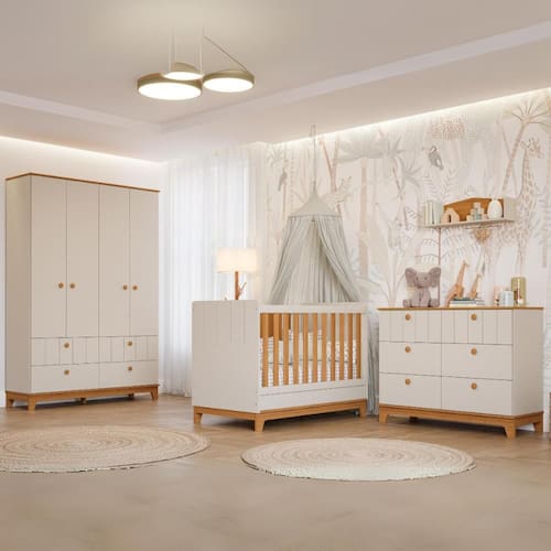 Complementando o berço, a Cômoda Estilo Retrô e o Roupeiro Estilo Retrô são ideais para criar um ambiente prático e elegante. A cômoda, com 6 gavetas espaçosas e um espaço projetado para o trocador, é equipada com puxadores em madeira maciça e um Kit Anti Tombamento para garantir a segurança. O roupeiro, com 4 gavetas e portas com dobradiças Slow Motion, oferece um armazenamento eficiente e um fechamento suave, mantendo o quarto organizado e charmoso. Juntos, esses móveis proporcionam um espaço acolhedor e sofisticado para o seu bebê.