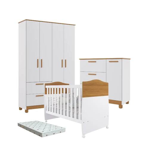 Esse modelo de berço foi desenvolvido pensando na fase bebê e na fase onde seu pequeno ou pequena já não quer mais ficar no berço. Para isso desenvolvemos um produto que pode se transformar em MINICAMA . Assim quando eles já forem maiores terão uma caminha linda e aconchegante para as noites de sono e você não precisará trocar seu móvel por um bom tempo. Nosso berço Conforto é fabricado com matéria-prima 100% MDF, um material ecologicamente correto e de ótima durabilidade e resistência. É um produto sinônimo de SEGURANÇA, pois é fabricado conforme as normas exigidas pela ABNT e certificado pelo INMETRO (Certificaçao Compulsória de segurança INMETRO).Possui 2 regulagens de altura para o estrado (uma mais alta para quando o bebê ainda é bem novinho e ainda não consegue sentar e outra mais baixa para quando o bebê já se movimenta e consegue ficar sentado). Atenção para a altura do colchão que não pode passar de 12cm. Suas 2 grades laterais são fixas para maior segurança e a régua superior e inferior são fabricadas com MDF de 2,5cm o que proporciona ainda mais segurança. Possui também 4 rodízios giratórios, sendo 2 com trava e 2 sem trava. As bordas são todas arredondadas e recebem pintura em lacca com tinta atóxica e as peças retas recebem pintura UV também com tinta e verniz atóxicos. Enviamos junto com o berço uma peça de ferro pintado (varão mosquiteiro) que encaixa nas cabeceiras e serve para colocação do cortinado, evitando assim que os pequenos sejam picados pelos mosquitos. Berço desenvolvido para uso de colchão padrão americano de 0,70x1,30m.Colchão acompanha;
