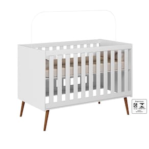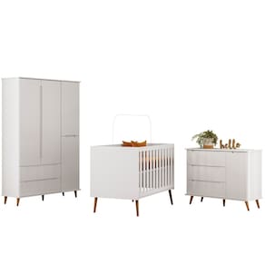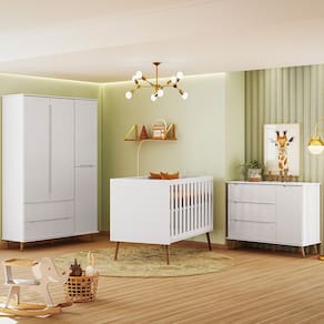 O Conjunto de Quarto Infantil Completo Retro Lunna; Berco Mini Cama Retro Noah são perfeitos para quem deseja um Quarto Infantil onde a praticidade, segurança, aconchego sejam pontos essenciais para a composição do quarto do seu Bebê, sem esquecer é claro de uma linda decoração. Todos os berços da Peternella são certificados pelo INMETRO. Um requisito fundamental para sua segurança e a do bebê. Berco Mini Cama Retro NoahO Berço/Mini Cama Retrô Noah Peternella é produzido em MDF bio-sustentável. É aprovado e certificado conforme regulamento do Inmetro, conta ainda com pintura UV, suporte para mosquiteiro, quatro pés de madeira, estilo retrô. Suas grades fixas de MDF proporcionam uma maior segurança ao bebê. Seu padrão é de berço americano e posteriormente poderá ser transformado em uma mini cama.CARACTERÍSTICASPintura Atóxica UV;Certificado pelo Inmetro;;Grades fixas;02 regulagens de altura do estrado.DimensõesAltura: 95 cmLargura: 133 cmProfundidade: 75 cm