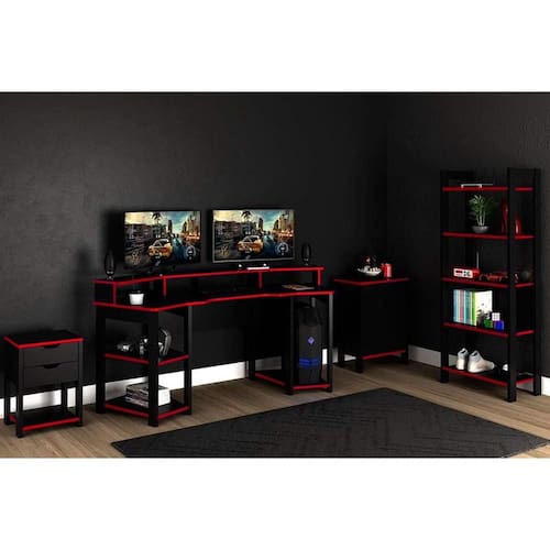 Abaixo segue os produtos do KIT: Quarto Completo Solteiro Gamer 4 Peças (Mesa Cabeceira + Mesa de Computador + Balcão + Estante) Preto/Vermelho - Tecno Mobili