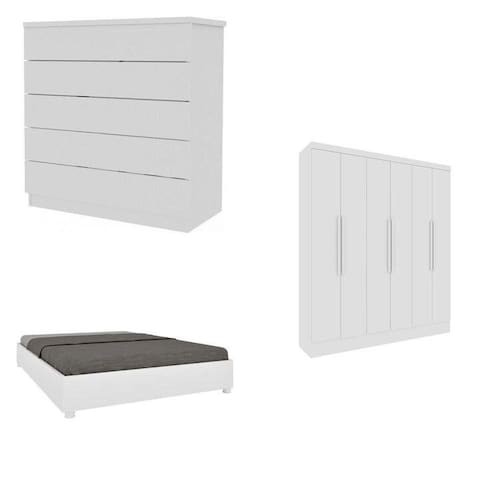 Guarda Roupa 6 Portas 180cm Munique Espresso Móveis, produto em MDP com espaço de armazenamento extenso e bem distribuído, puxadores em MDF, cabideiros em alumínio, 3 dobradiças de 26cm por porta, 4 gavetas internas com puxadores e corrediças telescópicas, que fornecem maior praticidade e segurança ao produto, possibilitando um deslizamento suave, firme e silencioso, prateleiras para acomodar e organizar suas roupas e objetos. Cama Casal Mônaco, produto em MDP, estrado de madeira reflorestada e ripas multi-laminadas, pés em PVC, dimensões para colchão 1380. Cômoda Premium, produto em MDF, 5 gavetas com puxadores laterais, corrediças telescópicas, tampo em MDF 25MM. Possui Rodízio: Não Acompanha Colchão: Não Altura do Conjunto: 204 cm Ambiente: Quarto Ambiente Principal: Quarto Cor: Neve Cor do Produto: Neve Informação Complementar: 1x Cama Casal 193cm x 144cm em MDP Mônaco Neve Largura: 144 cm Altura: 36 cm Peso: 28,9 kg Profundidade: 193 cm Necessita Montagem: Sim