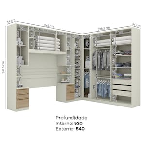 Fabricado com estrutura em MDP de 15 mm e portas em MDF/BP de 15 mm (fundo em 3 mm), conta com dobradiças metálicas de 35 mm com amortecimento e 9 gavetas com corrediças telescópicas, garantindo maior durabilidade e conforto no uso diário. São 16 prateleiras internas, com suporte para até 8 kg cada, além de cabideiros e calceiros em alumínio e puxadores de alça.