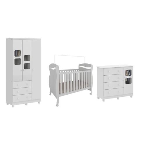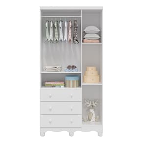 O Armário Júnior New 3 Portas é um produto 100% MDF e possui pintura atóxica. Sua estrutura é fabricada em chapa de 12 mm e seus pés são injetados em plástico de alta resistência. Os puxadores são também em plástico. Os cabideiros são metálicos e suas gavetas possuem corrediças apoiadas metálicas. Acompanha dois modelos de rodapés que podem ser definidos no momento da montagem.