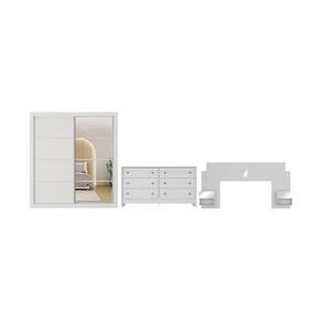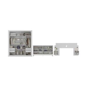 O guarda-roupa também possui puxadores de alumínio elegantes, cabideiros (até 3kg) para roupas longas e curtas, nichos generosos para roupas e calçados, além de um espaço superior pensado para cobertores e travesseiros. O guarda-roupa e a cabeceira contam com espelhos de vidro (3mm) lapidados (não possuem bordas cortantes), oferecendo a ideia de amplitude ao ambiente.