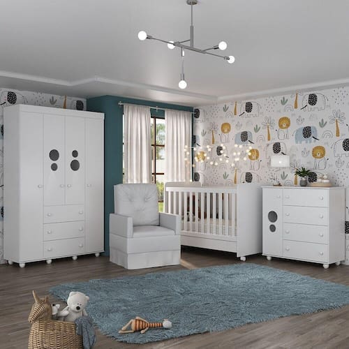 O Quarto Completo com Colchão e Poltrona de Amamentação Pimpolho Multimóveis MP4097 foi criado para facilitar a vida da mamãe nos preparativos para a chegada do bebê. Produzido em MDF/MDP com pintura UV e Laca PU (que garante maior durabilidade e facilidade na limpeza), o roupeiro possui amplo espaço interno, com 4 portas (com prateleiras e cabideiro) e 3 gavetas com corrediças metálicas que garantem mais leveza no manuseio. A cômoda possui 1 porta (com prateleira e cabideiro) e 4 gavetas espaçosas para organizar todos os pertences do bebê. As portas com detalhes e vidro incolor dão um toque alegre aos móveis. Para maior segurança, o roupeiro e cômoda acompanham kit com sistema antitombamento, que contribui para evitar acidentes. O berço é padrão americano (tamanho do colchão 130cm x 70cm) e se transforma em sofá e minicama, o que possibilita ser utilizado por mais tempo. O lastro possui 3 regulagens de altura para o colchão e acompanha suporte para mosquiteiro, que garante noites mais tranquilas de sono. A grade Soft (PVC) é produzida de maneira ecologicamente correta, com matéria-prima livre de metais pesados, atóxica e com proteção antiamarelamento. Berço certificado pelo INMETRO sob o Selo n° 005770/2018. O Colchão D18 (suporta 50kg), que acompanha o berço, é produzido 100% em tecido poliéster com preenchimento em espuma. Possui tratamento anti-ácaro e anti-alérgico e é indicado para crianças de até 3 anos. A poltrona de amamentação é produzida em madeira de eucalipto, com revestimento em material sintético, molas reforçadas e mecanismo de balanço, proporcionando muito aconchego. Capaz de suportar 110kg, o assento possui densidade D23, que garante maior conforto e durabilidade.