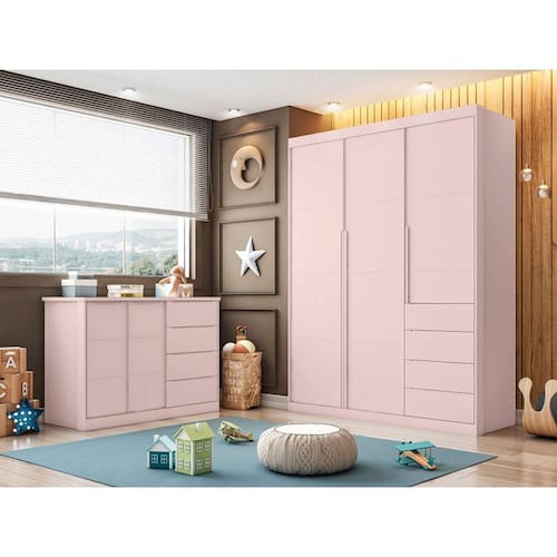 Quarto completo com Guarda Roupa 3 Portas e 4 Gavetas + Cômoda 2 Portas e 4 Gavetas Pérola Rosê - Phoenix Baby - Branco