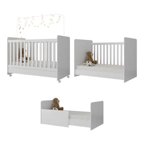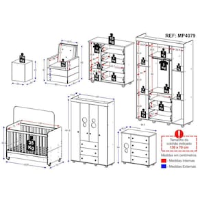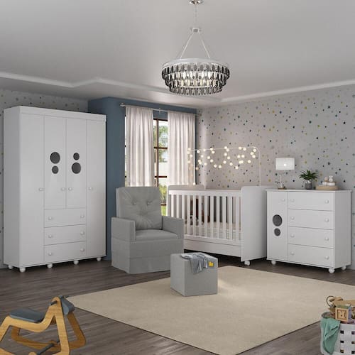 O Quarto Completo com Poltrona de Amamentação e Puff Pimpolho Multimóveis MP4079 foi criado para facilitar a vida da mamãe nos preparativos para a chegada do bebê. Produzido em MDF/MDP com pintura UV e Laca PU (que garante maior durabilidade e facilidade na limpeza), o roupeiro possui amplo espaço interno, com 4 portas (com prateleiras e cabideiro) e 3 gavetas com corrediças metálicas que garantem mais leveza no manuseio. A cômoda possui 1 porta (com prateleira e cabideiro) e 4 gavetas espaçosas para organizar todos os pertences do bebê. As portas com detalhes e vidro incolor dão um toque alegre aos móveis. Para maior segurança, o roupeiro e cômoda acompanham kit com sistema antitombamento, que contribui para evitar acidentes. O berço é padrão americano (tamanho do colchão 130cm x 70cm) e se transforma em sofá e minicama, o que possibilita ser utilizado por mais tempo. O lastro possui 3 regulagens de altura para o colchão e acompanha suporte para mosquiteiro, que garante noites mais tranquilas de sono. A grade Soft (PVC) é produzida de maneira ecologicamente correta, com matéria-prima livre de metais pesados, atóxica e com proteção antiamarelamento. Berço certificado pelo INMETRO sob o Selo n° 005770/2018. NÃO ACOMPANHA COLCHÃO. A poltrona de amamentação é produzida em madeira de eucalipto, com revestimento em tecido veludo, molas reforçadas e mecanismo de balanço, proporcionando muito aconchego. Capaz de suportar 110kg, o assento possui densidade D23, que garante maior conforto e durabilidade. Já o puff possibilita o descanso das pernas e dos pés tornando esse momento ainda mais confortável.