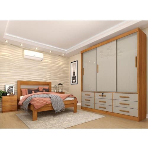 Roupeiro em MDP, 9 gavetas com corrediças telescópicas, trilho inferior em alumínio, trilho superior em PVC, cabideiro em alumínio, roldanas com rolamento deixando o movimento da porta suave, batente de porta, chave na gaveta central, puxadores em MDF. Cama em MDF, pés em MDF 30MM, moldura em MDF 25MM, painéis da cabeceira encaixados com perfil em PVC criando um detalhe geométrico, estrado em madeira reflorestada e ripas multilaminadas, quinto e sexto pés. Mesa de Cabeceira em MDF, 3 gavetas com puxadores nas laterais, corrediças telescópicas. Possui Rodízio: Não Acompanha Colchão: Não Altura do Conjunto: 214 cm Ambiente: Quarto Ambiente Principal: Quarto Cor: Cinamomo/Off White Informação Complementar: 1x Cama Casal Safira CinamomoLargura: 146 cmAltura: 115 cmPeso: 42,63 kgProfundidade: 198,5 cmNecessita Montagem: Sim1x Mesa de Cabeceira 3 Gavetas Veronna CinamomoLargura: 45Altura: 58Peso: 14.01Profundidade: 45Necessita Montagem: Sim1x Guarda Roupa Casal 3 Portas 9 Gavetas Chicago Cinamomo/Off WhiteLargura: 199 cmAltura: 214 cmPeso: 149,24 kgProfundidade: 51 cmNecessita Montagem: Sim Permite a Utilização de Cama Auxiliar: Não