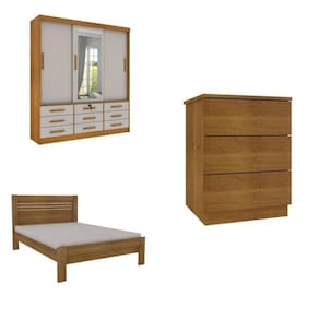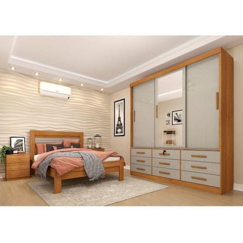 Roupeiro em MDP, 9 gavetas com corrediças telescópicas, trilho inferior em alumínio, trilho superior em PVC, cabideiro em alumínio, roldanas com rolamento deixando o movimento da porta suave, batente de porta, chave na gaveta central, puxadores em MDF. Cama em MDF, pés em MDF 30MM, moldura em MDF 25MM, painéis da cabeceira encaixados com perfil em PVC criando um detalhe geométrico, estrado em madeira reflorestada e ripas multilaminadas, quinto e sexto pés. Mesa de Cabeceira em MDF, 3 gavetas com puxadores nas laterais, corrediças telescópicas. Possui Rodízio: Não Acompanha Colchão: Não Altura do Conjunto: 214 cm Ambiente: Quarto Ambiente Principal: Quarto Cor: Cinamomo/Off White Informação Complementar: 1x Cama Casal Safira CinamomoLargura: 146 cmAltura: 115 cmPeso: 42,63 kgProfundidade: 198,5 cmNecessita Montagem: Sim1x Mesa de Cabeceira 3 Gavetas Veronna CinamomoLargura: 45Altura: 58Peso: 14.01Profundidade: 45Necessita Montagem: Sim1x Guarda Roupa Casal com Espelho 3 Portas 9 Gavetas Chicago Cinamomo/Off WhiteLargura: 199 cmAltura: 214 cmPeso: 159,3 kgProfundidade: 51 cmNecessita Montagem: Sim Permite a Utilização de Cama Auxiliar: Não