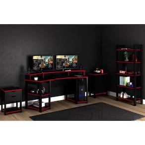 Quarto Completo Solteiro Gamer 4 Peças (Mesa Cabeceira + Mesa de Computador + Balcão + Estante) Preto/Vermelho - Tecno Mobili
