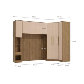 Com nichos de tamanhos diferentes, você poderá guardar calçados e roupas dobradas. Os cabideiros, metálicos e de suporte interno, são perfeitos para organizar peças maiores, como casacos e vestidos sem amassar. Já as gavetas, com corrediças telescópicas, são perfeitas para acessórios e peças menores, deixando seu espaço sempre organizado. Além disso, os aéreos otimizam espaço na vertical, enquanto o painel garante o acabamento de um quarto planejado. Com caixaria em pintura touch na cor nogueira, com a textura dos veios da madeira, as portas são na cor macadâmia em acabamento brilho.