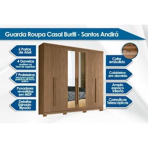GUARDA ROUPA CASAL 6 PORTAS (2 RIPADAS) E 4 GAVETAS C/ ESPELHO E PÉS BURITI JATOBÁ SANTOS ANDIRÁ