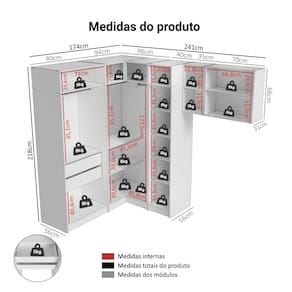 O conjunto é formado por três módulos do guarda-roupa, que oferecem prateleiras, gavetas e cabideiros, garantindo espaço para roupas, calçados e acessórios. Além disso, conta com dois armários aéreos, perfeitos para aproveitar o espaço do quarto e manter tudo sempre bem organizado.
