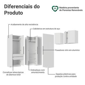 Os diferenciais da linha Neo garantem mais durabilidade no dia a dia: ferragens de alta qualidade, como dobradiças com amortecimento, gavetas com corrediças de abertura total, cabideiros metálicos e puxadores slim em alumínio que completam o design sofisticado. O acabamento branco de alta resistência facilita a combinação com diferentes estilos de decoração.