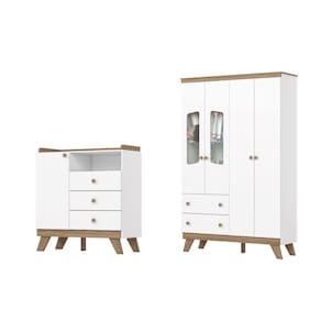 Quarto de Bebê com Guarda Roupa 4 Portas e Cômoda 3 Gavetas Lola Henn, a cômoda é uma peça moderna e funcional, feita em MDF/MDP, com gavetas de deslize suave e uma porta usinada. É ideal para quem busca praticidade em um espaço compacto. Também apresenta o Guarda Roupa Infantil, espaçoso e elegante, com gavetas com corrediças telescópicas, cabideiro em alumínio e portas em vidro, proporcionando sofisticação e otimização de espaço, completando o design com pés em MDP de 25 mm.
