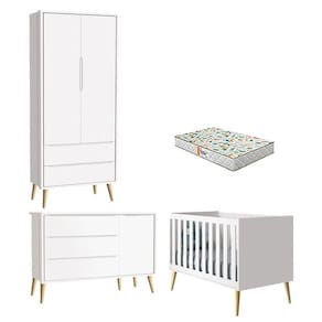 Quarto de Bebê 2 Portas Theo Branco Pés Madeira Natural com Colchão Gazin Reller