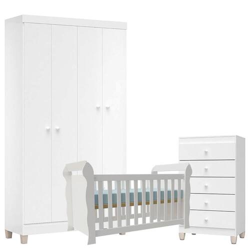 Quarto de Bebê 4 Portas com Gaveteiro Ternura Baby e Berço Lara Branco Brilho - Incorplac