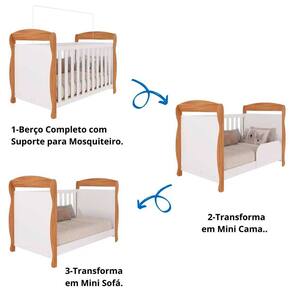 O Berço, no padrão americano, é fabricado em 100% MDF de alta qualidade. Conta com pintura atóxica e acompanha varal para mosquiteiro, proporcionando noites tranquilas e protegidas. Com base do colchão ajustável em 2 alturas, adapta-se ao crescimento do bebê. Além disso, é um modelo 3 em 1: berço, mini cama e mini sofá, oferecendo versatilidade e excelente custo-benefício.