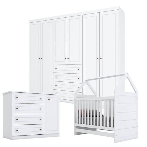 Quarto de Bebê Americano 6 Portas com Berço Montessoriano Branco HP - Henn