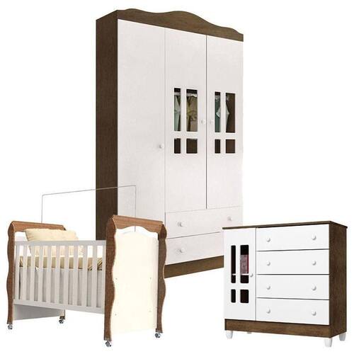 Quarto de Bebê Ariel 3 Portas com Berço New Nanda Branco Acetinado Amadeirado - Carolina