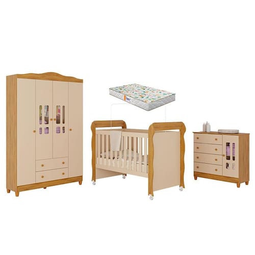 Quarto de Bebê Ariel 4 Portas com Berço Americano Mirelle Off White Bétula com Colchão Gazin –Carolina Baby