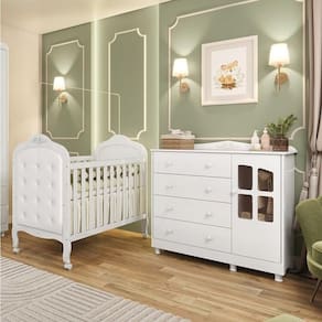 Um ambiente encantador e delicado, transmitindo tranquilidade e conforto para todos. Produtos fabricados com linhas suaves em estrutura 100% MDF e acabamento em Pintura UV atóxica.. As gavetas possuem corrediças telescópicas para facilitar o deslize das gavetas e o espaço interno com prateleiras e cabideiro em alumínio, proporcionando armazenamento prático para roupas e itens essênciais. A porta da cômoda é em PETG Cristal/Acrílico permitindo a visualização do seu interior. O berço é um charme com suas bordas curvas e rodízios, sendo 2 com travas. Além disso, é certificado pelo INMETRO e pode ser utilizado como Mini Cama ou Mini Sofá, acompanhando o crescimento do seu bebê. Ambiente composto por: 1 Cômoda 113 x 120,30 x 50,30 (AxLxP - cm) 1 Berço com acabamento 120 x 140 x 78,30 (AxLxP - cm)