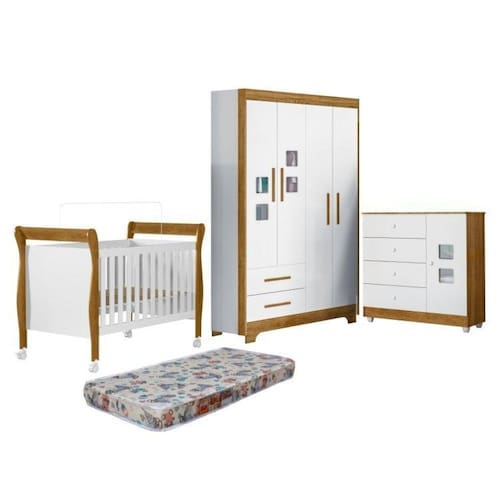 Dê as boas-vindas ao seu bebê com nosso conjunto completo para quarto de bebê. Com um berço confortável e seguro, uma cômoda espaçosa e detalhes encantadores, cada peça é cuidadosamente projetada para criar um ambiente acolhedor e funcional. Proporcione ao seu bebê o conforto e a praticidade que ele merece, enquanto adiciona um toque de charme ao espaço. Altura do Conjunto: 187 cm Ambiente: null Ambiente Principal: Quarto de Bebê Cor: Branco/Madeirado Ypê Estrado com Regulagem de Altura: Sim Informação Complementar: 1x Guarda Roupa de Bebê 100% MDF 4 Portas 2 Gavetas Fly Flex Color Branco/Ypê/Branco Largura: 119,5 cm Altura: 187 cm Peso: 65,12 kg Profundidade: 40 cm