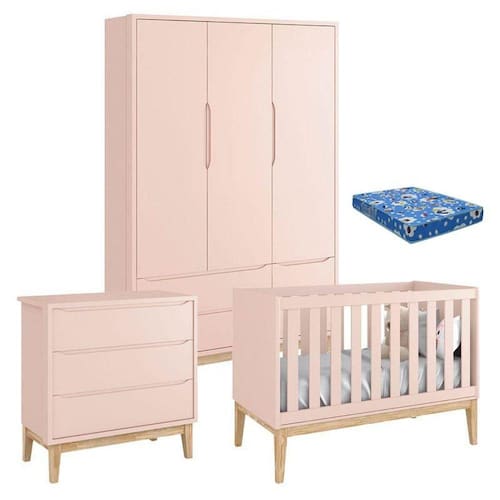 Quarto de Bebê Classic 3 Portas com Colchão e Cômoda Gaveteiro Pés Madeira Natural - Reller