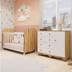 Procurando por móveis que ofereçam conforto e praticidade para a sua família? Esta proposta é perfeita para você! Produzidos em 100% MDF com acabamento em pintura UV atóxica, esse quarto garante a segurança de todos. A cômoda possui 1 porta e 4 gavetas com corrediças telescópicas, proporcionando facilidade no uso. O berço possui bordas arredondadas, certificado pelo INMETRO, e acompanha varal para mosquiteiro. Aproveite essa oportunidade e adquira já o seu!