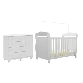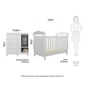 99 x 148 x 78,40 (AxLxP - cm) Acompanha Colchão: Não Altura do Conjunto: 99 cm Ambiente Principal: Quarto de Bebê codigo_ean: 7900288103192 Cor: Branco Brilho Cor do Produto: Branco Brilho Estrado com Regulagem de Altura: Sim Informação Complementar: 1x Cômoda Infantil 1 Porta 4 Gavetas 100% MDF Mimo Branco Brilho Necessita Montagem: Sim