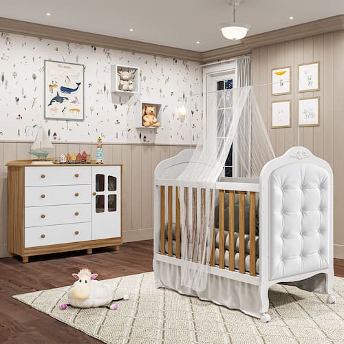 Um ambiente encantador e delicado, transmitindo tranquilidade e conforto para todos. Produtos fabricados com linhas suaves com estrutura em 100 MDF e acabamento em Pintura UV at?xica ? o destaque deste ambiente. As gavetas possuem corredi?as telesc?picas para facilitar o deslize das gavetas e os espa?os internos proporcionam armazenamento pr?tico para roupas e itens essenciais em suas prateleiras e nos cabideiros em alum?nio. Algumas portas possuem janelas em PETG Cristal/Acr?lico permitindo a visualiza??o do seu interior. O ber?o ? um charme com suas bordas curvas, capiton? em corino e rod?zios. Al?m disso, ? certificado pelo INMETRO e pode ser utilizado como Mini Cama ou Mini Sofa, acompanhando o crescimento do seu beb?.