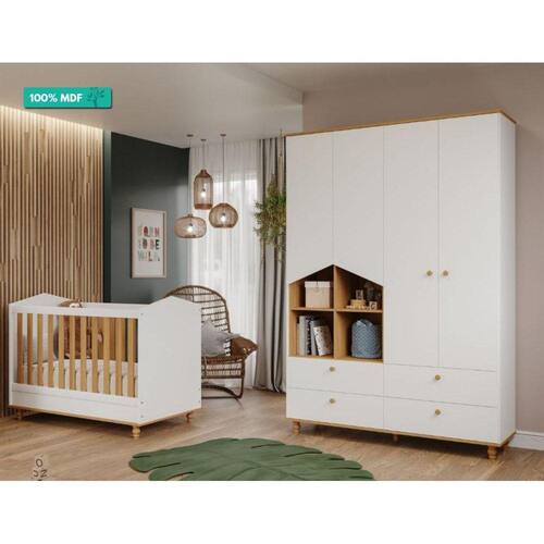 Quarto de Bebê com Berço Minicama Mimo e Guarda Roupa 4 portas e 4 gavetas Casinha Permobili Branco/