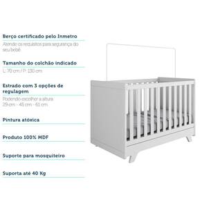 Inspirado no estilo retro do passado com um toque de modernidade a linha Retrô da Móveis Peroba é encantadora. O berço é certificado pelo INMETRO no registro 000781/2018, tem a opção de ser utilizado como mini cama, acompanha um suporte para mosquiteiro e a base do colchão é regulável em 3 opções de altura, aumentando o conforto no uso diário e na segurança com o crescimento do seu pequeno(a). Todos os móveis são com acabamento em pintura UV atóxica e com a qualidade de ser produzido em 100% MDF. A cômoda possui 1 cabideiro, as gavetas possuem corrediças telescópicas e suportam até 4kg cada. Tudo para oferecer um quartinho aconchegante, pratico e lindo para o seu bebê.