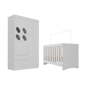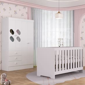 Quarto de Bebê com Guarda Roupa 4 Portas 3 Gavetas com Janela Berço 3 em 1 Maya Rodial, combina estilo e organização, com estrutura robusta em MDP e MDF, acabamento em pintura UV fosca e detalhes elegantes como puxadores em MDF e cabideiro de madeira revestida. Oferece durabilidade e praticidade, protegido por embalagem segura. O Berço Maya 3 em 1 une segurança e versatilidade, transformando-se em mini-cama e sofá, com estrado ajustável e bordas de PVC para maior proteção. Feito com materiais de alta qualidade e acabamento moderno, é uma escolha prática e confiável para quartos infantis.