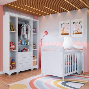 Esse quarto foi criado pensando no conforto e segurança que seu bebê merece. No Quarto Nina todos os produtos são fabricados com materiais de qualidade, com estrutura em 100% MDF e acabamento em Pintura UV atóxica. O guarda roupa possui 4 portas e 3 gavetas com corrediças telescópicas, facilitando assim o deslize ao abrir e fechar. O berço é em padrão americano e pode ser utilizado como mini cama ou mini sofá acompanhando o crescimento do bebê. Além disso, é certificado pelo INMETRO. Adquira o quarto Nina e proporcione um ambiente encantador e seguro para o seu bebê crescer e se desenvolver feliz.